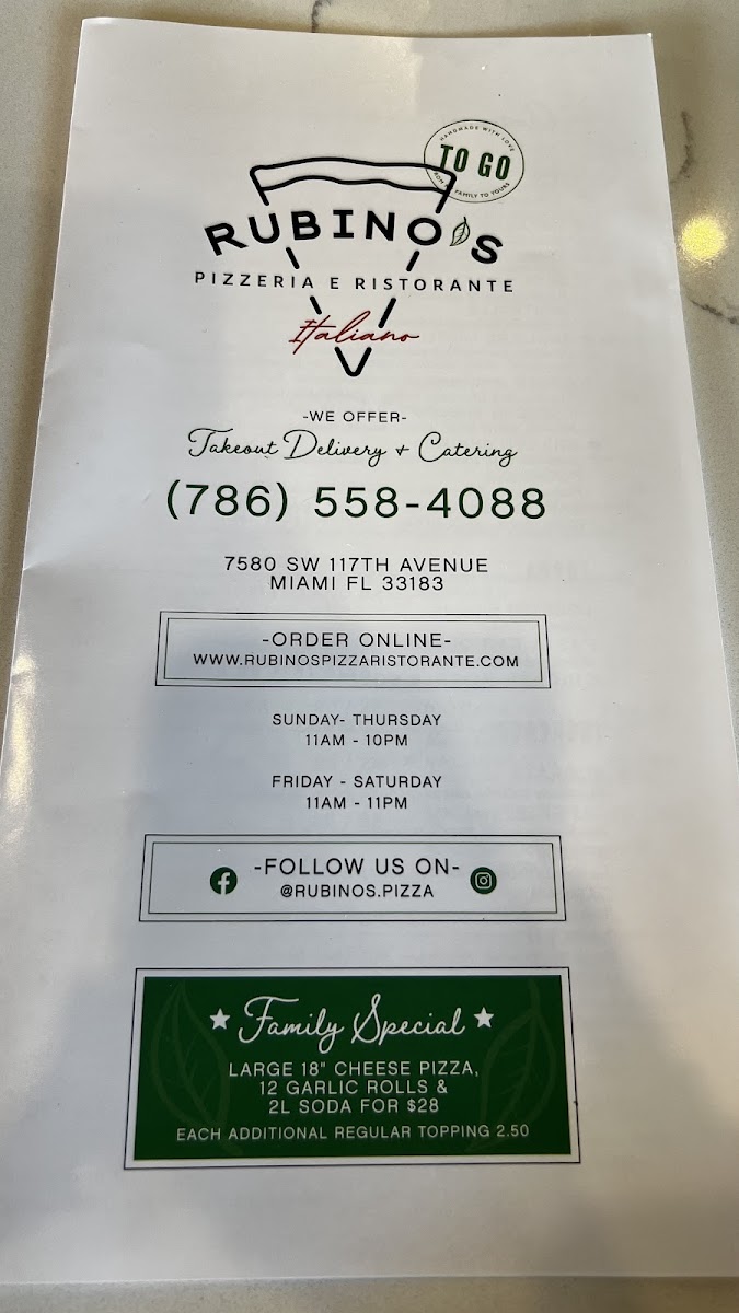If you’re on the hunt for an inviting Italian dining experience in Miami, look no further than Rubino's Pizzeria e Ristorante Italiano. Nestled at 7580 SW 117th Ave, this family-owned gem is recognized for its rich Argentine-Italian heritage, proudly run by owners with an extensive culinary background, including 20 years of success with Ferrari’s Pizzeria.